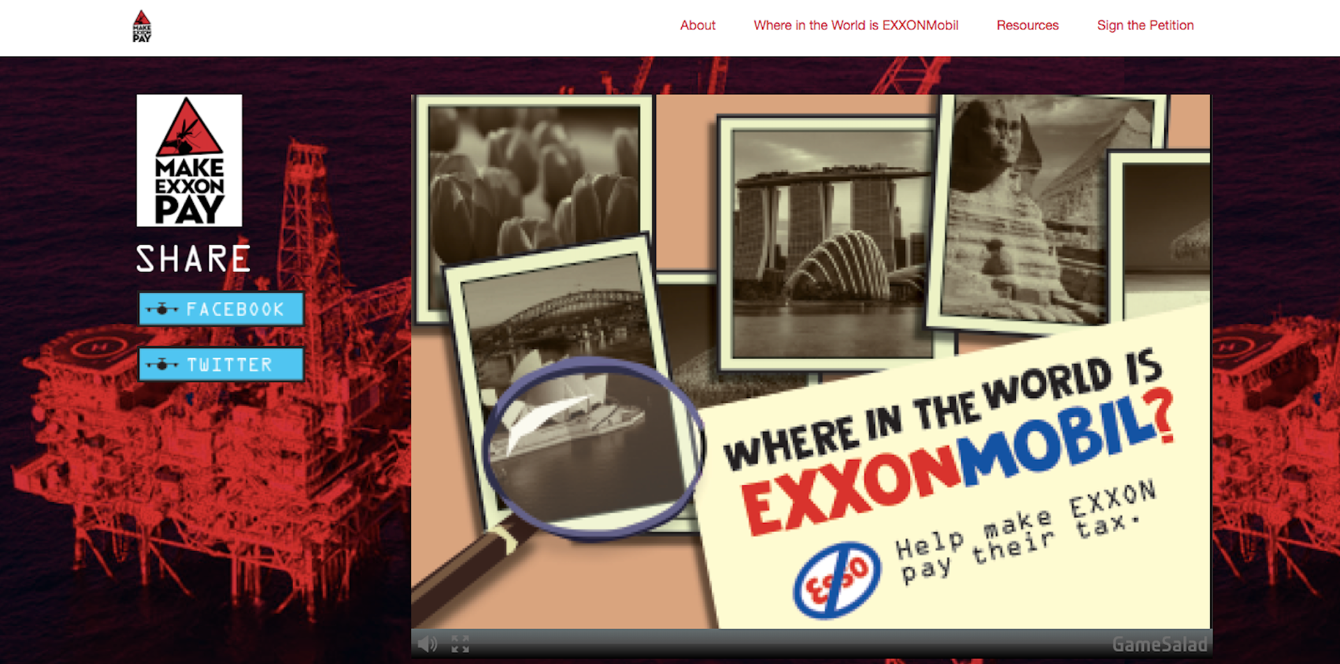 Make EXXON Pay campaign. Including website, Where in the World is Exxon Mobil game, and report design. Play the game here: